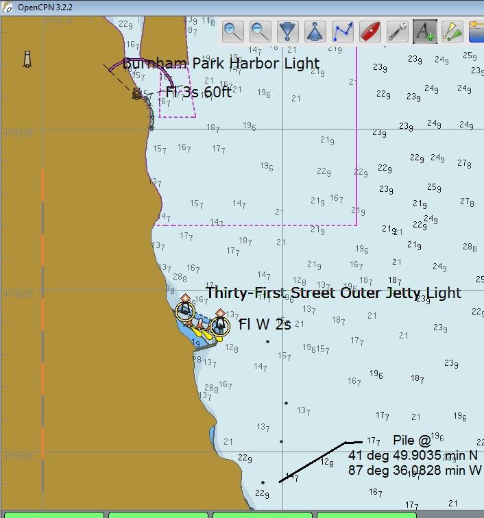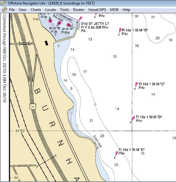 Maptech's Offshore Navigator Lite shows lights on the the breakwater.